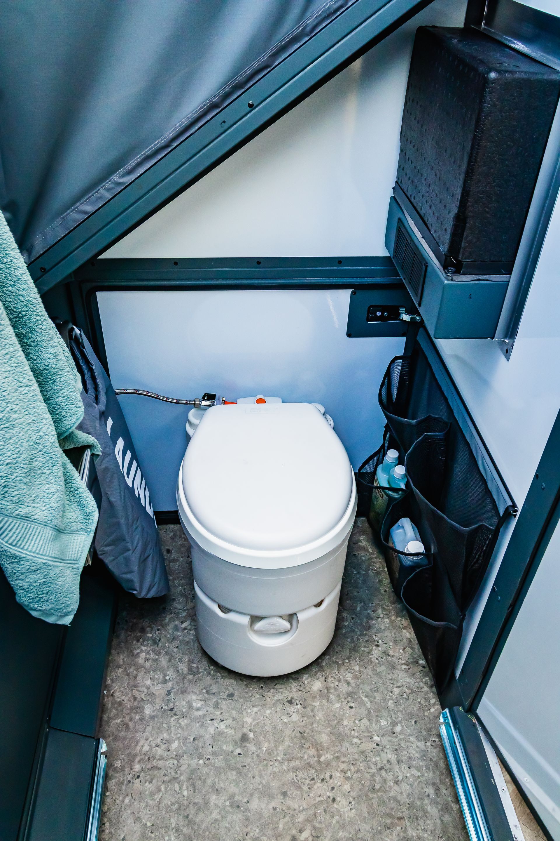 The space created by the pull-out kitchen transforms into a bathroom with a toilet, shower, and basin. For an open-air shower experience, the bathroom roof can be opened.